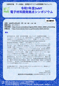 D2MatEでは令和7年度DxMT電子材料開発拠点シンポジウムを以下のように開催いたします。 元素戦略MDX研究センターはこのシンポジウムを共催いたします。 開催日時:2025年12月15日(月)10:00 ~ 16:40 開催方法:オンライン 参加費:無料 参加登録:こちらの登録フォームからご登録下さい。